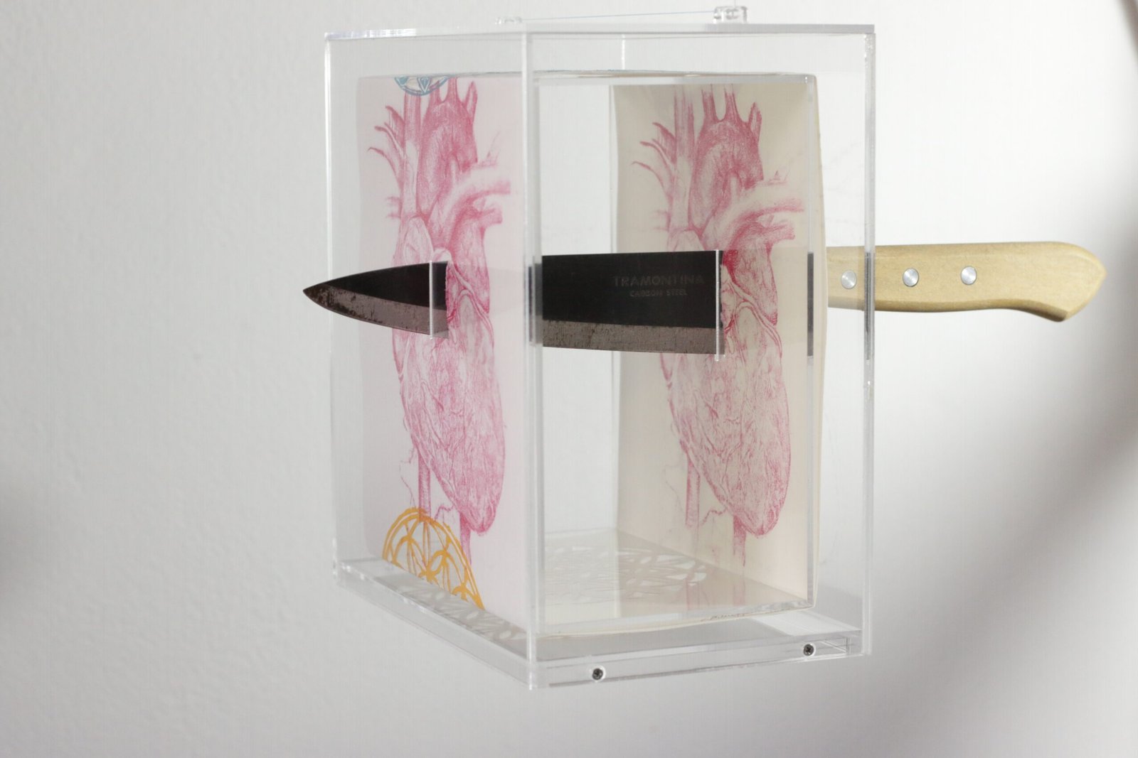 La muestra incluye 16 grabados, una video-performance, una cerámica, un libro de artista y un sketchbook. Pedrosa explora memoria, cicatrices y experiencias somatizadas a través de técnicas como bordado, collage, esténcil y soportes como papel vegetal y tela.