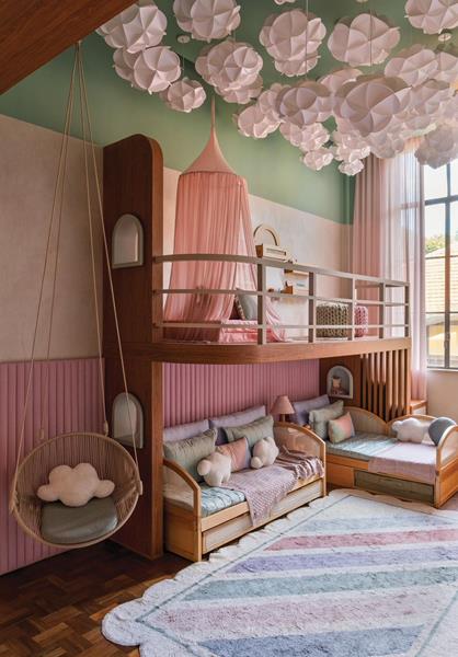 O quarto conta com área de leitura elevada, pufes em formato de flor, uma cadeira suspensa e um cantinho de descanso com dossel. Tudo pensado para equilibrar beleza, funcionalidade e sensorialidade — sem cair no óbvio. Materiais sustentáveis, como tecidos reciclados e madeira certificada, completam a proposta com consciência.