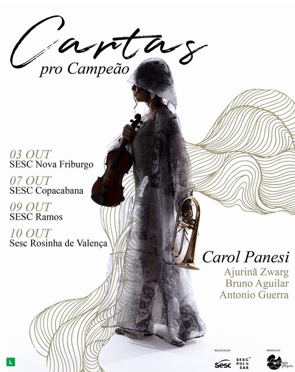 Uma correspondência recebida do saudoso Hermeto Pascoal foi a pedra fundamental para o novo show da multi-instrumentista e compositora Carol Panesi, “Cartas pro Campeão”, que estreia em turnê pelo RJ na programação do Sesc Pulsar em outubro. O espetáculo em homenagem ao mestre da música universal será apresentado nas unidades do Sesc em Nova Friburgo (03/10, sexta-feira, às 20h), Copacabana (07/10, terça-feira, às 19h), Ramos (09/10, quinta-feira, às 19h) e Rosinha de Valença (10/10, sexta-feira, às 20h).