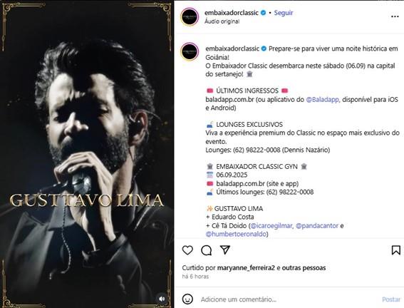 O Embaixador está de volta a Goiânia! No dia 06 de setembro de 2025, o cantor Gusttavo Lima apresenta o espetáculo “O Embaixador Classic”, um show grandioso com orquestra ao vivo, que promete emocionar o público com novos arranjos de seus maiores sucessos.