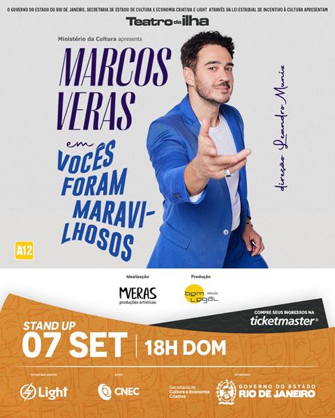 Ingressos: de R$ 50 a R$ 120, vendas no site https://www.ticketmaster.com.br/event/marcos-veras-no-teatro-da-ilha-rj Classificação: 12 Anos (Menores de 12 anos, somente acompanhados de responsáveis legais)