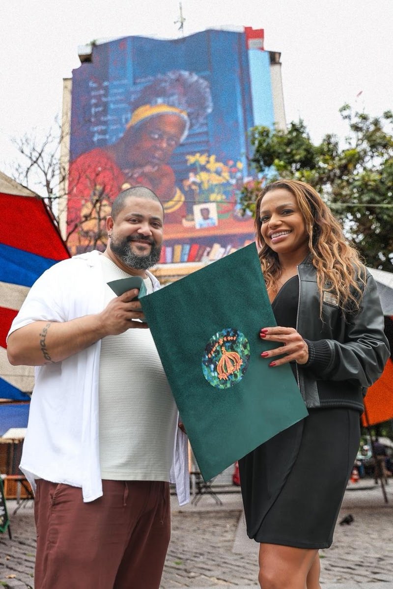 A rainha de bateria Quitéria Chagas recebeu, na tarde desta sexta-feira (10), o croqui de sua fantasia para o Carnaval 2026 da Império Serrano. A entrega foi feita pelo carnavalesco Renato Esteves, na Pedra do Sal, no bairro da Saúde, região central do Rio de Janeiro. O local é conhecido pelo mural que celebra a escritora mineira Conceição Evaristo, homenageada do próximo desfile da escola.