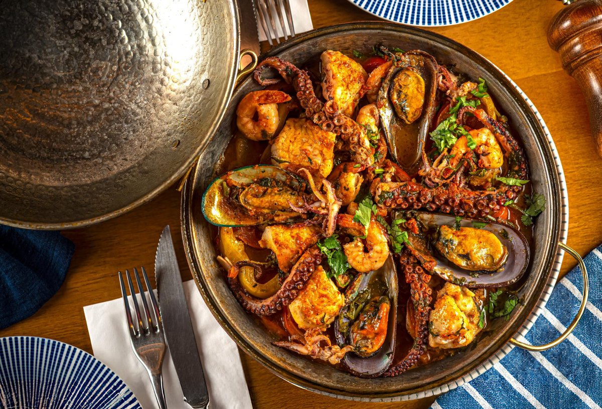 - Cataplana de Marisco à Algarvia – serve 2 pessoas, com tamboril, camarão, polvo, lula, sardinha e mexilhão