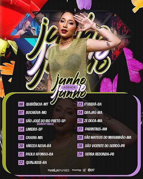 Neste mês de junho, período marcado pelas tradicionais festas de São João, Juninas e rodeios, a artista embarca em uma intensa turnê com mega shows em diversos estados do país, incluindo Bahia, Paraíba, Maranhão, Amazonas, Mato Grosso, São Paulo e Minas Gerais. Uma agenda de respeito que confirma o seu crescimento meteórico e a força do seu talento no cenário nacional.