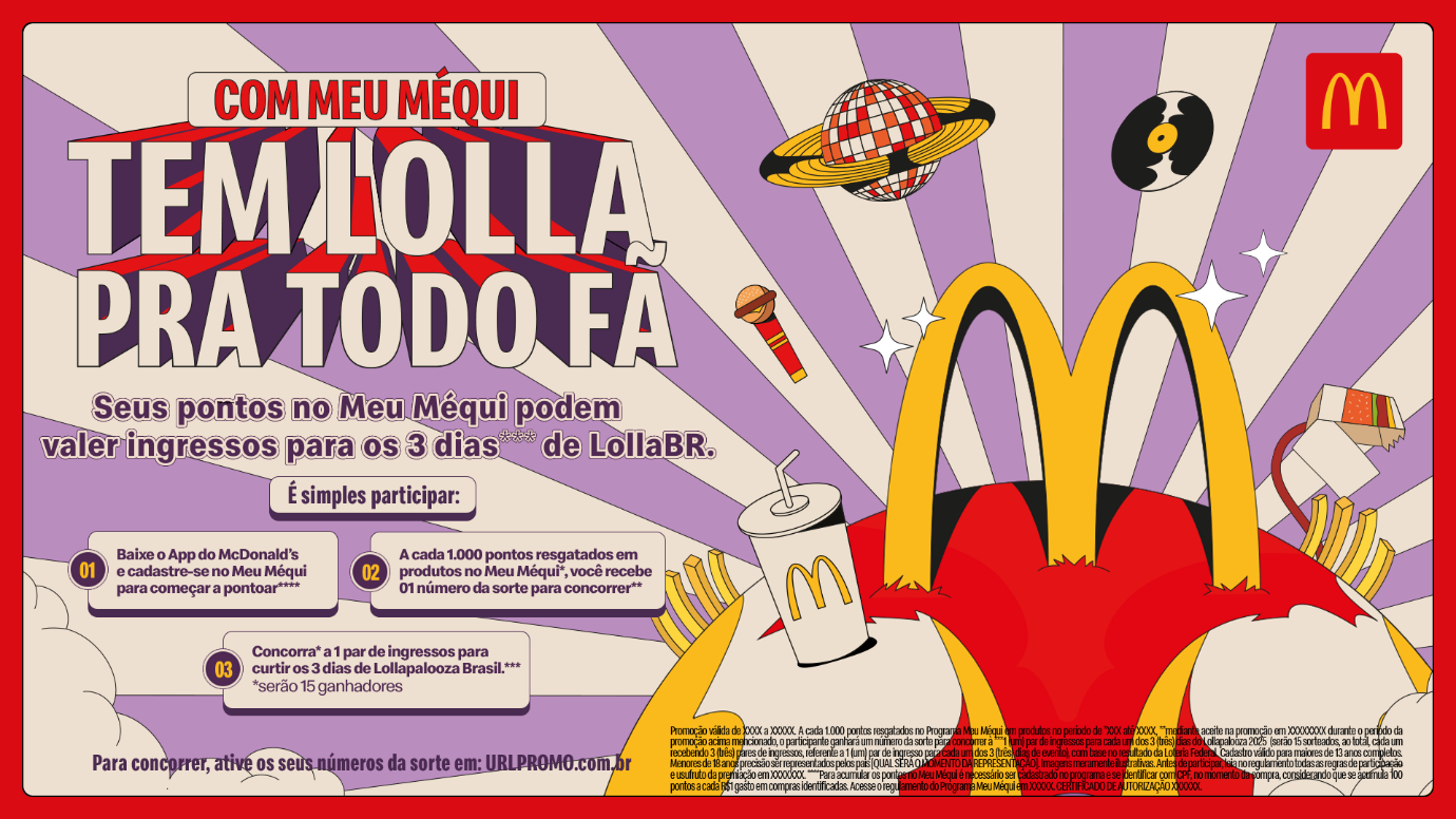 O Lollapalooza Brasil 2025 está chegando e o McDonald’s, patrocinador oficial, vai levar 15 clientes sortudos – com direito a um acompanhante – para curtir o festival! Na promoção “Com Meu Méqui tem LollaBR pra todo fã”, participantes do Meu Méqui, programa de fidelidade da marca, que resgatarem, pelo menos, 1.000 (mil) pontos em produtos e confirmar o interesse na participação da promoção, concorrem a 1 (um) par de ingressos para aproveitar os três dias de shows, que acontecem nos dias 28, 29 e 30 de março, no Autódromo de Interlagos.