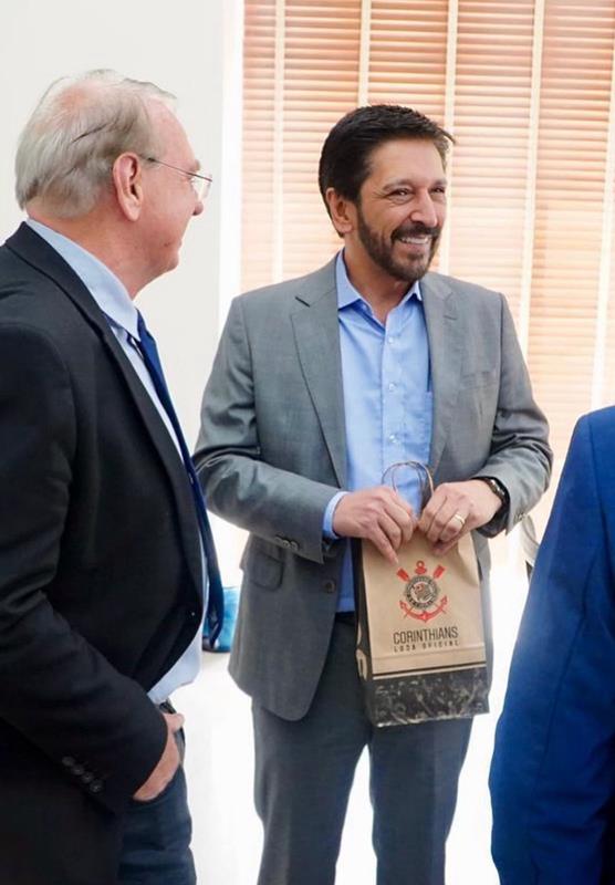 O prefeito Ricardo Nunes recebeu o presidente do Corinthians, que entregou uma camisa oficial personalizada com o nome de Regina Nunes, corintiana apaixonada e madrinha do Departamento Social da Gaviões da Fiel